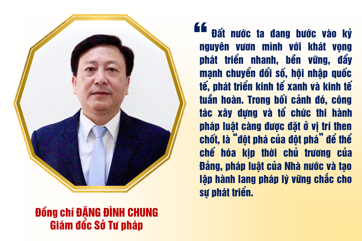 Thảo luận về giải pháp “Đổi mới công tác xây dựng và thi hành pháp luật đáp ứng yêu cầu phát triển đất nước trong kỷ nguyên mới”, đại biểu Đặng Đình Chung - Giám đốc Sở Tư pháp như: Bảo đảm sự lãnh đạo toàn diện, trực tiếp của các cấp uỷ Đảng trong công tác xây dựng và tổ chức thi hành pháp luật, phát huy cao độ tính Đảng trong xây dựng và thi hành pháp luật; Tổ chức triển khai thực hiện Luật Ban hành văn bản quy phạm pháp luật năm 2025 được sửa đổi, bổ sung; Đổi mới tư duy, định hướng xây dựng pháp luật vừa đáp ứng yêu cầu quản lý nhà nước, vừa khuyến khích sáng tạo, tạo mọi nguồn lực cho phát triển kinh tế - xã hội tại địa phương; Tạo đột phá trong công tác tổ chức thi hành pháp luật, bảo đảm pháp luật được thực hiện nghiêm minh, kịp thời, hiệu lực và hiệu quả; Tăng cường nguồn nhân lực có chất lượng cao về xây dựng pháp luật, có chính sách đặc thù, vượt trội để thu hút, nâng cao chất lượng nguồn nhân lực tham gia các nhiệm vụ, hoạt động xây dựng pháp luật và tổ chức thi hành pháp luật trên địa bàn tỉnh. Đồng thời, chú trọng biểu dương, khen thưởng, lan tỏa mạnh mẽ cách làm mới, hiệu quả của các cơ quan, đơn vị và cá nhân.