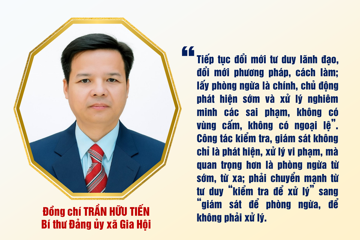 Thảo luận vào dự thảo báo cáo chính trị của ban Chấp hành Trung ương Đảng khóa XIII trình tại Đại hội đại biểu toàn quốc lần thứ XIV của Đảng, đại biểu Trần Hữu Tiến - Bí thư Đảng ủy xã Gia Hội đề xuất về các nhiệm vụ, giải pháp nhằm tăng cường công tác kiểm tra, giám sát, kỷ luật của đảng: Không ngừng nâng cao nhận thức, trách nhiệm của cấp ủy, Tổ chức đảng, người đứng đầu cấp ủy các cấp về vị trí, vai trò, ý nghĩa, tác dụng của công tác kiểm tra, giám sát và kỷ luật của Đảng; Tập trung đổi mới toàn diện phương thức lãnh đạo và tổ chức thực hiện nhiệm vụ kiểm tra, giám sát theo phương châm “Giám sát phải mở rộng, kiểm tra phải có trọng tâm, trọng điểm”; Nâng cao chất lượng tự kiểm tra trong nội bộ Đảng; Phối hợp tốt giữa Ủy ban Kiểm tra và chính quyền, Mặt trận Tổ quốc, các tổ chức chính trị - xã hội trong nắm bắt dư luận, giám sát cán bộ, đảng viên ở cơ sở; Tăng cường ứng dụng công nghệ thông tin trong công tác kiểm tra, giám sát, khai thác hiệu quả kho dữ liệu số, xây dựng, tạo lập dữ liệu, bảo đảm cập nhật “Đúng, đủ, sạch, sống”; Phát huy mục đích, hiệu quả, ý nghĩa của công tác kiểm tra, giám sát, phải xác định những vấn đề, lĩnh vực yếu nhất, gây bức xúc trong nhân dân để tiến hành kiểm tra, giám sát.