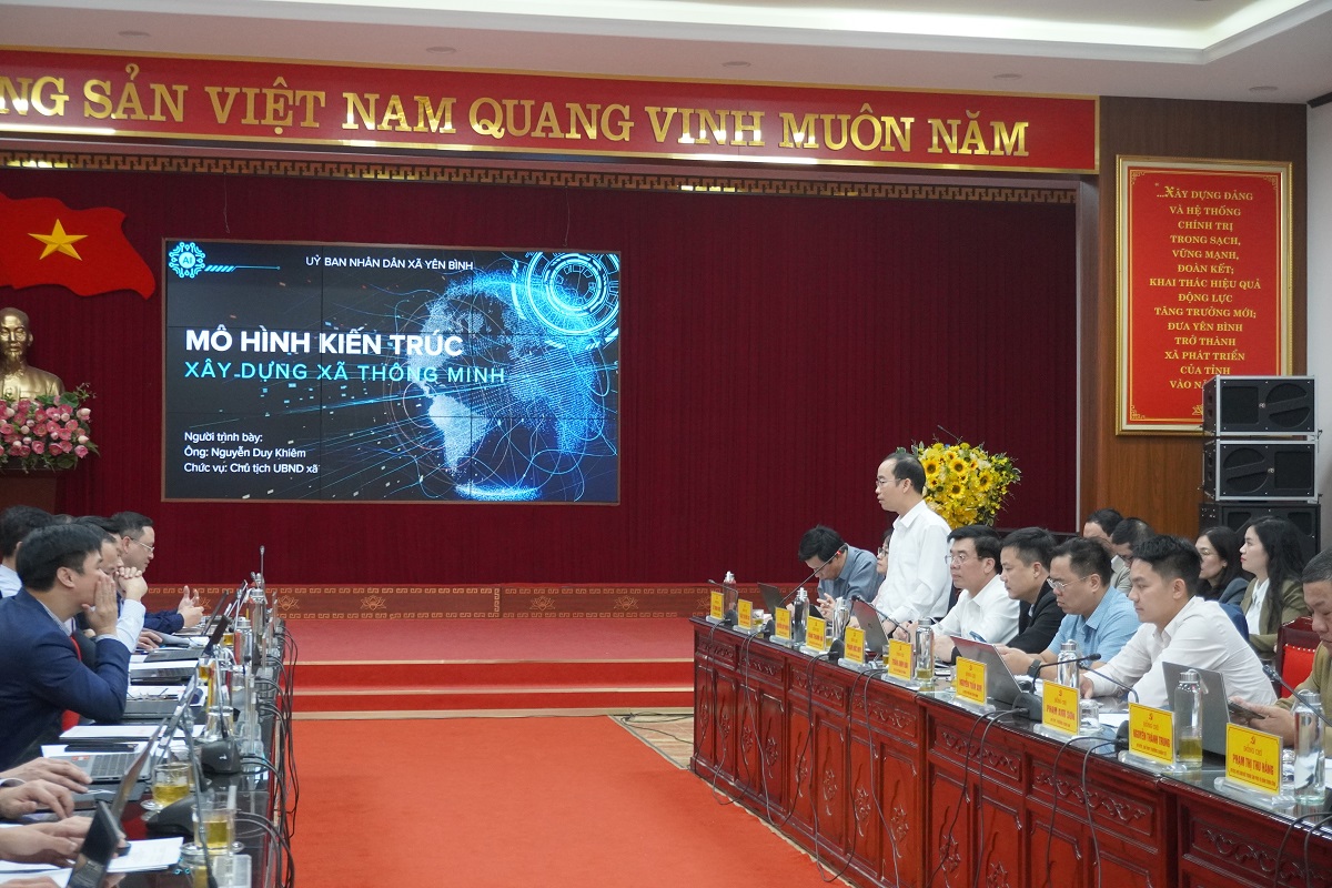 Phát biểu tại buổi làm việc, đồng chí Trần Ngọc Luận đánh giá cao những kết quả mà xã Yên Bình đã đạt được, cụ thể như: Trong việc xây dựng chính quyền số, 98% văn bản Đảng ủy được xử lý trên hệ thống điều hành tác nghiệp; UBND xã thực hiện 100% trình ký số, bàn làm việc số được đưa vào vận hành, theo dõi trên 225 nhiệm vụ, mô hình Cabin hành chính công thông minh đã hỗ trợ người dân nộp gần 300 hồ sơ trực tuyến, đưa tỷ lệ hồ sơ trực tuyến lên 98,46%, hài lòng của người dân đạt 100%; Trong phát triển kinh tế số: Nhiều sản phẩm OCOP đã được truy xuất nguồn gốc; ứng dụng thương mại điện tử qua các sàn thương mại điện tử, các điểm du lịch, dịch vụ triển khai thanh toán không tiền mặt; một số cơ sở tích cực bán hàng qua livestream, Bước đầu đã hình thành các mô hình sản xuất nông nghiệp ứng dụng IoT, hệ thống tưới tự động; Trong xã hội số, giáo dục sử dụng đồng bộ các phần mềm ngành; y tế đạt 98% hồ sơ sức khỏe điện tử; Telehealth hoạt động hiệu quả, An ninh trật tự được tăng cường qua hệ thống camera giám sát và dữ liệu dân cư. Những kết quả này cho thấy Yên Bình đang đi đúng hướng, có quyết tâm chính trị cao và có nền tảng tốt để triển khai mô hình xã thông minh phiên bản 1.0.