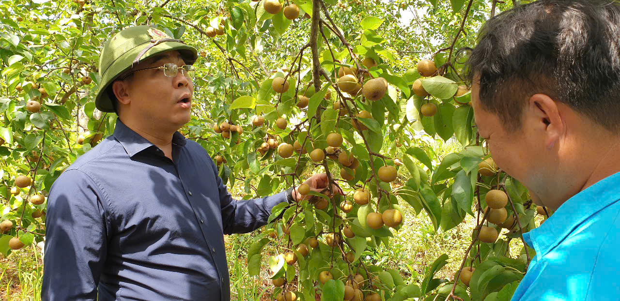 Đồng chí Nông Việt Yên, Ủy viên BCH Đảng bộ tỉnh, nguyên Bí thư Huyện ủy Mù Cang Chải kiểm tra tình hình sản xuất Lê