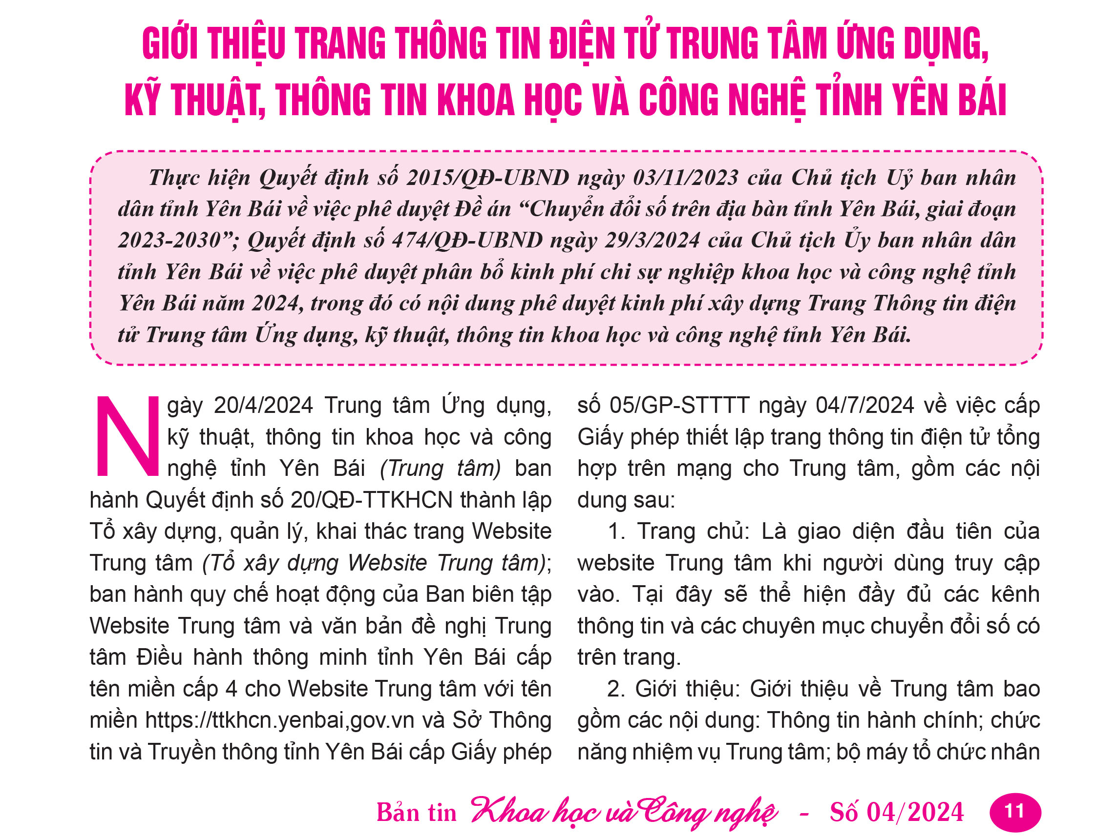 Giới thiệu Trang thông tin điện tử Trung tâm Ứng dụng, Kỹ thuật, Thông tin khoa học và Công nghệ tỉnh Yên Bái