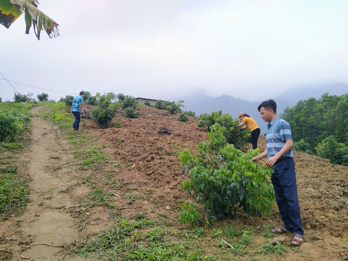 Hình ảnh: Cán bộ kỹ thuật của đơn vị đang kiểm tra tình hình sinh trưởng cây vải chín sớm PH40 tại xã Văn Chấn